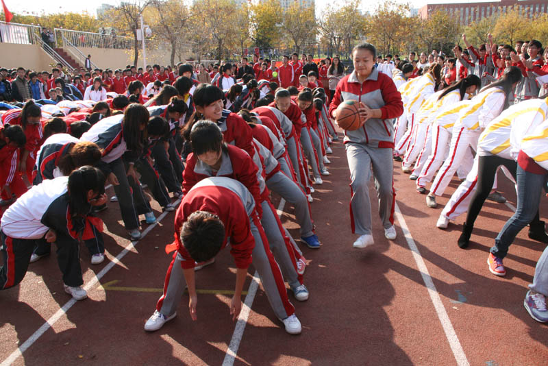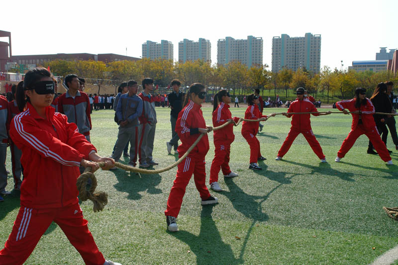 来自12个学院的2013级全体同学团体操汇演结束后,在西操场的南、北两侧比赛场地开始了气氛热烈、high爆全场的趣味比赛项目。本届趣味运动共有10个团体比赛项目,来自日照校区12个学院的近2000名学生参加了比赛。10个项目分别为海底捞月、盲人背瘸子、纸衣往返跑、自行车慢骑、心心相印(背夹球)、信任人椅、盲人方阵、合力吹气球、信任背摔、无敌风火轮。这10个创意十足的比赛项目,以培养同学们的人际沟通能力和团体协作意识为目标,旨在帮助同学们塑造乐观阳光的心态、坚强不屈的意志,积极向上的个性以及和谐的人际关系。比赛过程中,各院系参赛队员积极、投入、互相配合的完成比赛项目,在欢呼声、呐喊声和加油声中享受着比赛。在主席台就坐的领导老师们不禁走下主席台,近距离感受趣味运动项目带给大家的快乐和热情。尽管是在比赛,但本着“趣味”和“心智拓展”的原则,让同学们在比赛中获得乐趣,放松自己。