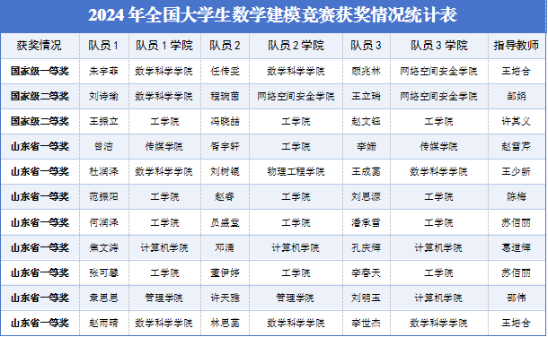 曲阜师大数学科学学院讯  近日,由教育部高等教育司和中国工业与应用数学学会联合主办的2024年全国大学生数学建模竞赛获奖名单公布,曲阜师大在激烈的竞争中脱颖而出,斩获国家一等奖1项、二等奖2项,山东省一等奖8项、二等奖20项、三等奖30项,国家级奖项获奖数量在省属本科院校中名列前茅,取得了本项赛事参赛历史上的最佳成绩。