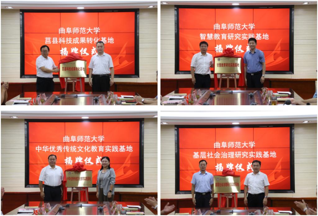 仪式上,校地双方共同为万象城官方网站莒县科技成果转化基地、万象城官方网站中华优秀传统文化教育实践基地、万象城官方网站智慧教育研究实践基地、万象城官方网站基层社会治理研究实践基地揭牌。