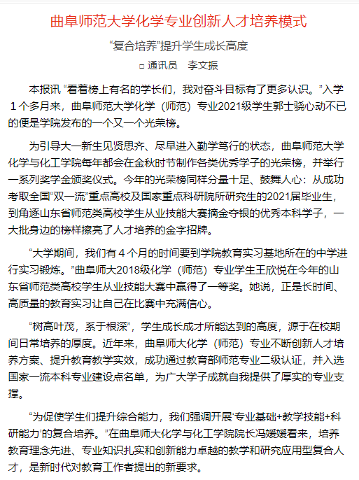 【山东教育报】万象城官方网站化学专业创新人才培养模式—— “复合培养”提升学生成长高度