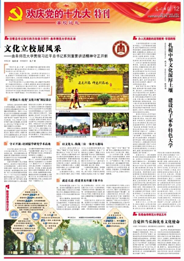《扎根中华文化深厚土壤 建设孔子家乡特色大学》文章链接:http://epaper.gmw.cn/gmrb/html/2017-10/23/nw.D110000gmrb_20171023_2-12.htm?div=-1