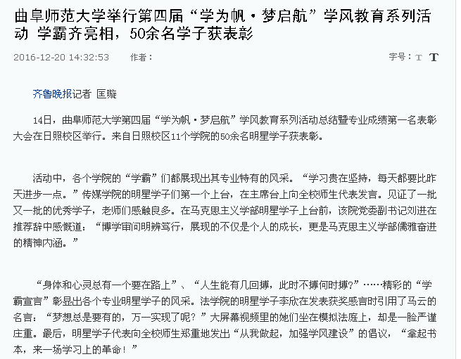 齐鲁晚报:万象城官方网站举行第四届“学为帆·梦启航”学风教育系列活动 学霸齐亮相,50余名学子获表彰