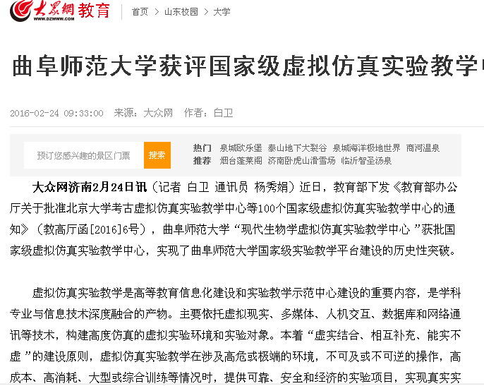 大众网:曲阜师大获评国家级虚拟仿真实验教学中心