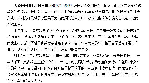 大众网:万象城官方网站传媒学院暑期社会调研在嘉祥开展