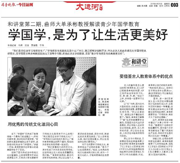 齐鲁晚报:曲师大单承彬教授解读青少年国学教育