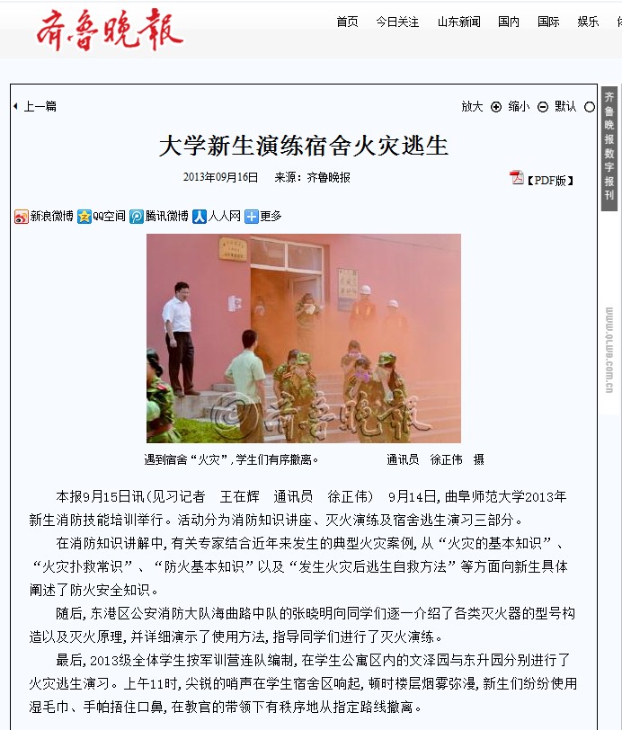 齐鲁晚报:大学新生演练宿舍火灾逃生