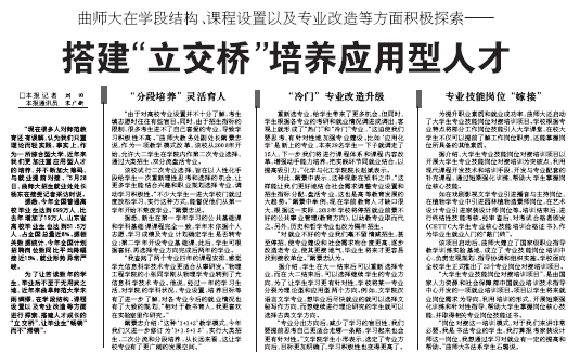 近日,《大众日报》刊发通讯报道《曲师大在学段结构、课程设置及专业改造等方面积极探索——搭建‘立交桥’培养应用型人才》。报道从“‘分段培养’灵活育人”、“‘冷门’专业改造升级”、“专业技能岗位‘嫁接’”等三个方面,全方位介绍了我校紧紧围绕育人质量,在教育教学改革和就业创业教育等方面做出的积极探索,取得的明显成效。