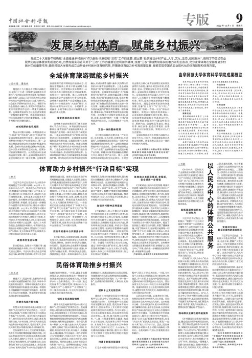 曲阜师大体育科学学院讯 日前,中国社会科学报在“发展乡村体育、赋能乡村振兴”专版中刊登了万象城官方网站山东省乡村振兴体育研究院执行副院长曹莉教授团队的系列成果,其内容包括:体育助力乡村振兴“行动目标”、构建以人民为中心的体育公共服务、全域体育旅游赋能乡村振兴、民俗体育助推乡村振兴等主题的阶段性战略研究。报道还对学校体育科学学院近年来取得的相关成绩进行了列举,相关科研成果为全国农村体育发展提供理论依据和现实借鉴,标志着团队的研究在乡村体育领域处于省内领先地位、对全国乡村体育研究形成较大影响。