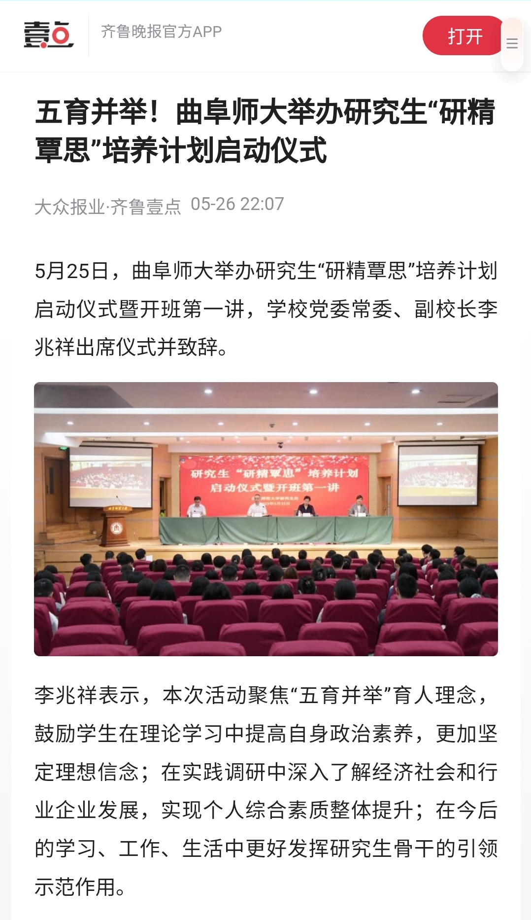 【齐鲁晚报·齐鲁壹点】五育并举!曲阜师大举办研究生“研精覃思”培养计划启动仪式