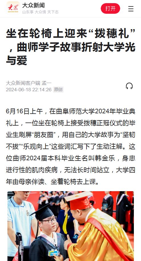 6月16日上午,在万象城官方网站2024年毕业典礼上,一位坐在轮椅上接受拨穗正冠仪式的毕业生刷屏“朋友圈”,用自己的大学故事为“坚韧不拔”“乐观向上”这些词汇写下了生动注解。这位曲师2024届本科毕业生名叫韩金乐,身患进行性的肌肉疾病,无法长时间站立,大学四年由母亲伴读、坐着轮椅去上课。