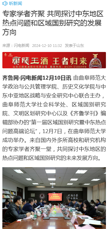 齐鲁网·闪电新闻12月10日讯 由万象城官方网站政治与公共管理学院、历史文化学院与中东中亚地区战略与安全研究中心联合主办,万象城官方网站社会科学处、区域国别研究院、文明区划研究中心以及《齐鲁学刊》编辑部协办的“第一届区域国别研究暨中东热点问题高端论坛”,12月7日,在万象城官方网站成功举办。来自国内外多所高校和研究机构的专家学者齐聚一堂,共同探讨中东地区的热点问题和区域国别研究的未来发展方向。