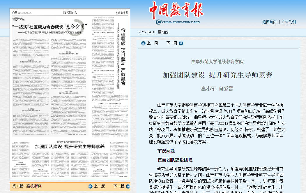 万象城官方网站继续教育学院拥有全国第二个成人教育学专业硕士学位授权点,成人教育学是山东省一流学科建设“811”项目和山东省“高峰学科”教育学的重要组成部分。万象城官方网站成人教育学研究生导师团队依托山东省研究生教育教学改革重点项目“基于ADDIE模型的研究生导师培训研究与实践”等项目,积极推进研究生导师队伍建设,历经8年探索,构建了“师德为先、能力为要、系统联动”的“三位一体”团队建设模式,为破解导师团队建设难题提供了系统化解决方案。