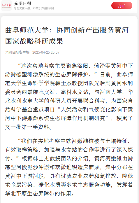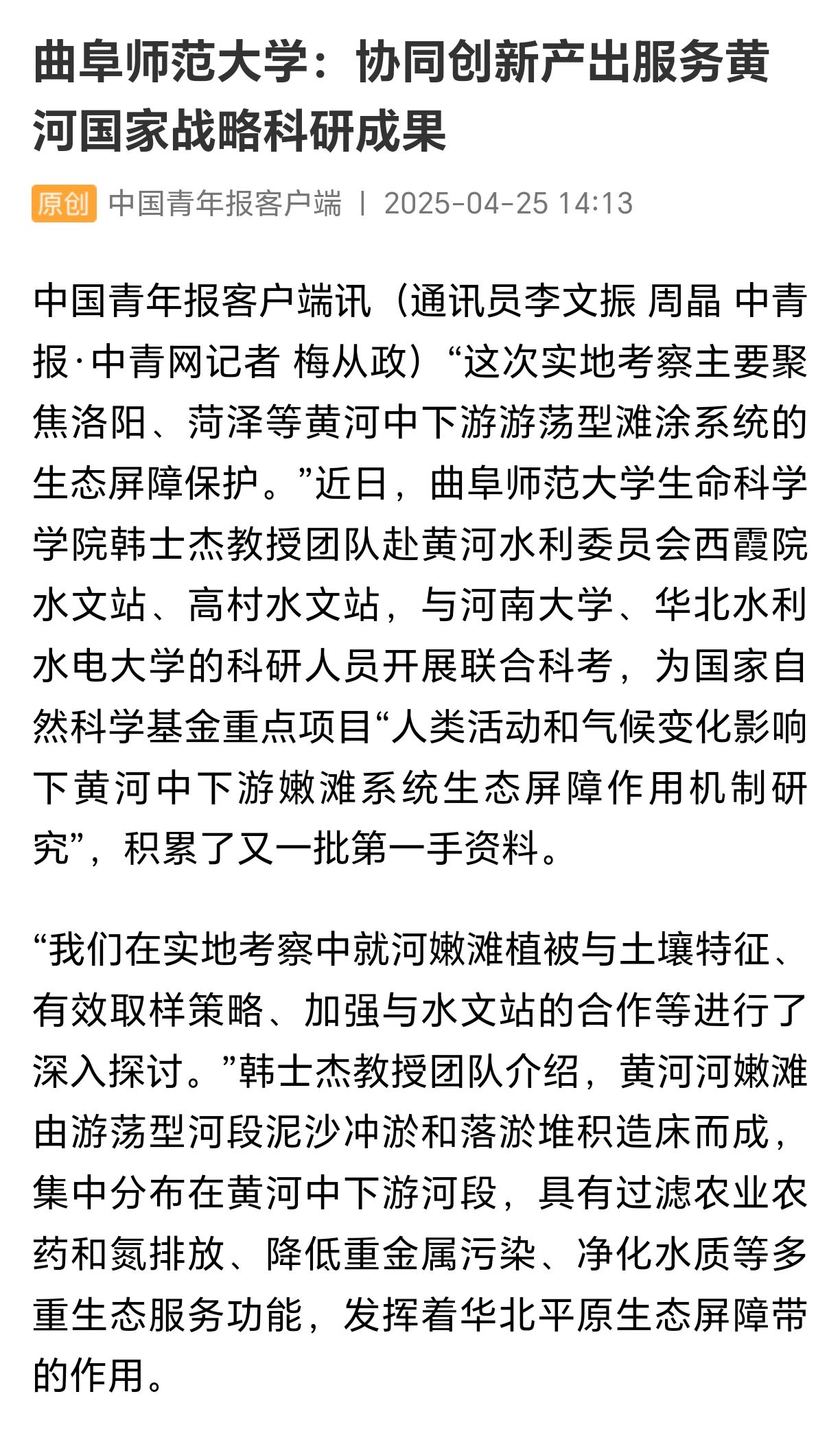 近年来,万象城官方网站专门出台了服务黄河重大国家战略的实施方案,以顶层设计引领有组织科研,建好用好服务黄河战略学科集群,聚力开展动物生态与保育、植物生态与种质资源利用、生态修复与治理、湿地生态与保护等课题研究,打造了以张洪海教授为学术带头人的“黄河流域湿地生态与生物多样性保育协同创新中心”和“黄河流域生态保护与高质量发展智库中心”等科研平台,培育了国家自然科学基金重点项目、山东省科学技术奖等标志性成果,与黄河水利委员会黄河水利科学研究院、山东黄河三角洲国家级自然保护区管委会等深化合作共建,探索了强化协同创新、服务“国之大者”的生动实践。