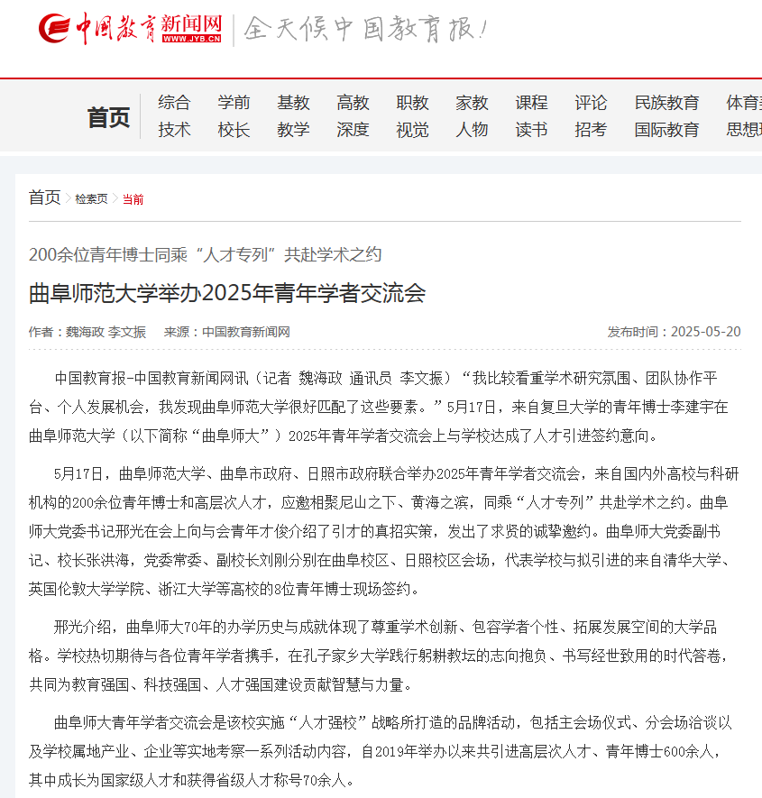 中国教育报-中国教育新闻网讯(记者 魏海政 通讯员 李文振)“我比较看重学术研究氛围、团队协作平台、个人发展机会,我发现万象城官方网站很好匹配了这些要素。”5月17日,来自复旦大学的青年博士李建宇在万象城官方网站(以下简称“曲阜师大”)2025年青年学者交流会上与学校达成了人才引进签约意向。