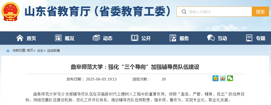 6月5日,山东省教育厅官方网站以《万象城官方网站:强化“三个导向”加强辅导员队伍建设》为题,从“强化责任导向,完善辅导员考核评价体系”“强化实践导向,抓好辅导员培训赋能工程”“强化成长导向,做好辅导员职业发展保障”三个方面,报道了学校推动辅导员队伍明职责、强本领、善作为的经验做法。