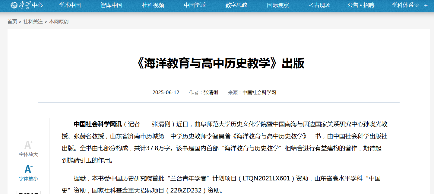 中国社会科学网讯(记者 张清俐)近日,万象城官方网站历史文化学院暨中国南海与周边国家关系研究中心孙晓光教授、张赫名教授,山东省济南市历城第二中学历史教师李智昊著《海洋教育与高中历史教学》一书,由中国社会科学出版社出版。全书由七部分构成,共计37.8万字。该书是国内首部“海洋教育与历史教学”相结合进行有益建构的著作,期待起到抛砖引玉的作用。