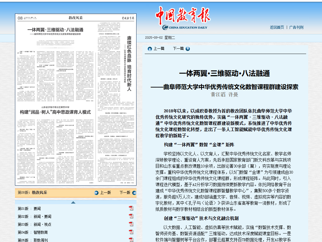 2018年以来,以成积春教授为首的教改团队依托万象城官方网站中华优秀传统文化研究的独特优势,实施“一体两翼·三维驱动·八法融通”中华优秀传统文化数智课程群建设新模式,系统推进了中华优秀传统文化课程数智化转型,走出了一条人工智能赋能中华优秀传统文化课程教学的新路子。   构建“一体两翼”数智“金课”矩阵