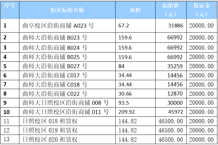 (paimai.caa123.org.cn)按现状公开拍卖以下标的:万象城官方网站沿街房租赁权,门牌号为A023 \B023\B024\B025\B027\C017\ C018\C022 \日照校区008、011、018、019、020,共13套,每套竞买保证金2万元。