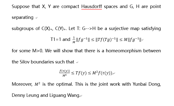 摘要:In this talk, I will talk about the compact operators under Orlicz function, named noncommutative Orlicz sequence space (denoted by Sϕ(H)), where H is a complex, separable Hilbert space. I will show that the space generalizes the Schatten classes Sp(H) and the classical Orlicz sequence space respectively. After getting some relations of trace and norm, I will give some operator inequalities, Holder inequality and some other classical operator inequalities. Also I will give the dual space and reflexivity of Sϕ(H) which generalizes the results of Sp(H). Finally, as an application, that the Toeplitz operator on the Bergman space belongs to some Sϕ(H).