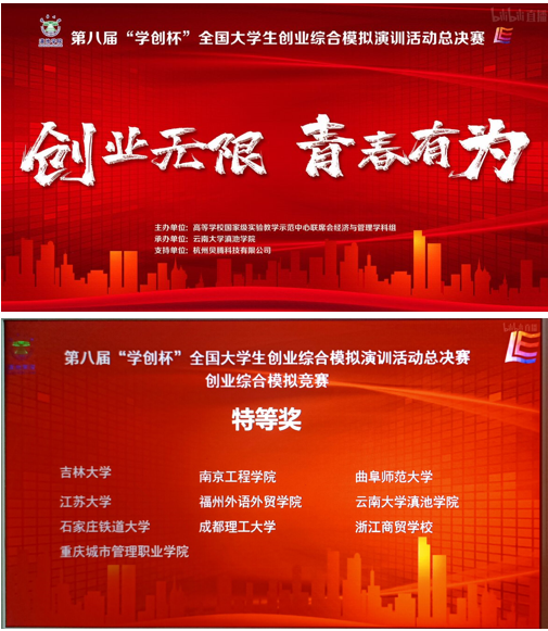 “学创杯”是教育部《全国普通高校大学生竞赛排行榜》新认可的国家级A类赛事。全国共有1075所高校、3万多支队伍、15万名师生参加本届大赛,达历年之最,最终有230余所院校晋级全国总决赛。历经院赛、校赛、省赛选拔,曲阜师大管理学院三名学子——队长2018级工商管理辛方磊、队员2019级工商管理闫晓雯、2019级财务管理董珂宜组成的团队在“学创杯”山东省主体赛中从108所院校、280支队伍中脱颖而出荣获省级一等奖,并以E赛区第一的成绩晋级全国总决赛。经过团队成员的不懈努力,最终在全国总决赛的创业策划书和创业模拟两项赛事评比中综合成绩名列前茅,荣获全国特等奖。巩天雷老师被评为大赛最佳指导教师。