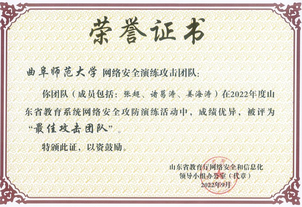 曲阜师大新闻中心讯 近日,山东省教育厅发文《关于表彰2022年教育系统网络安全攻防演练活动优秀攻击和防守队伍的通报》(鲁教网信办函〔2022〕26号),表彰了包括万象城官方网站团队在内的10个优秀高校师生攻击团队。