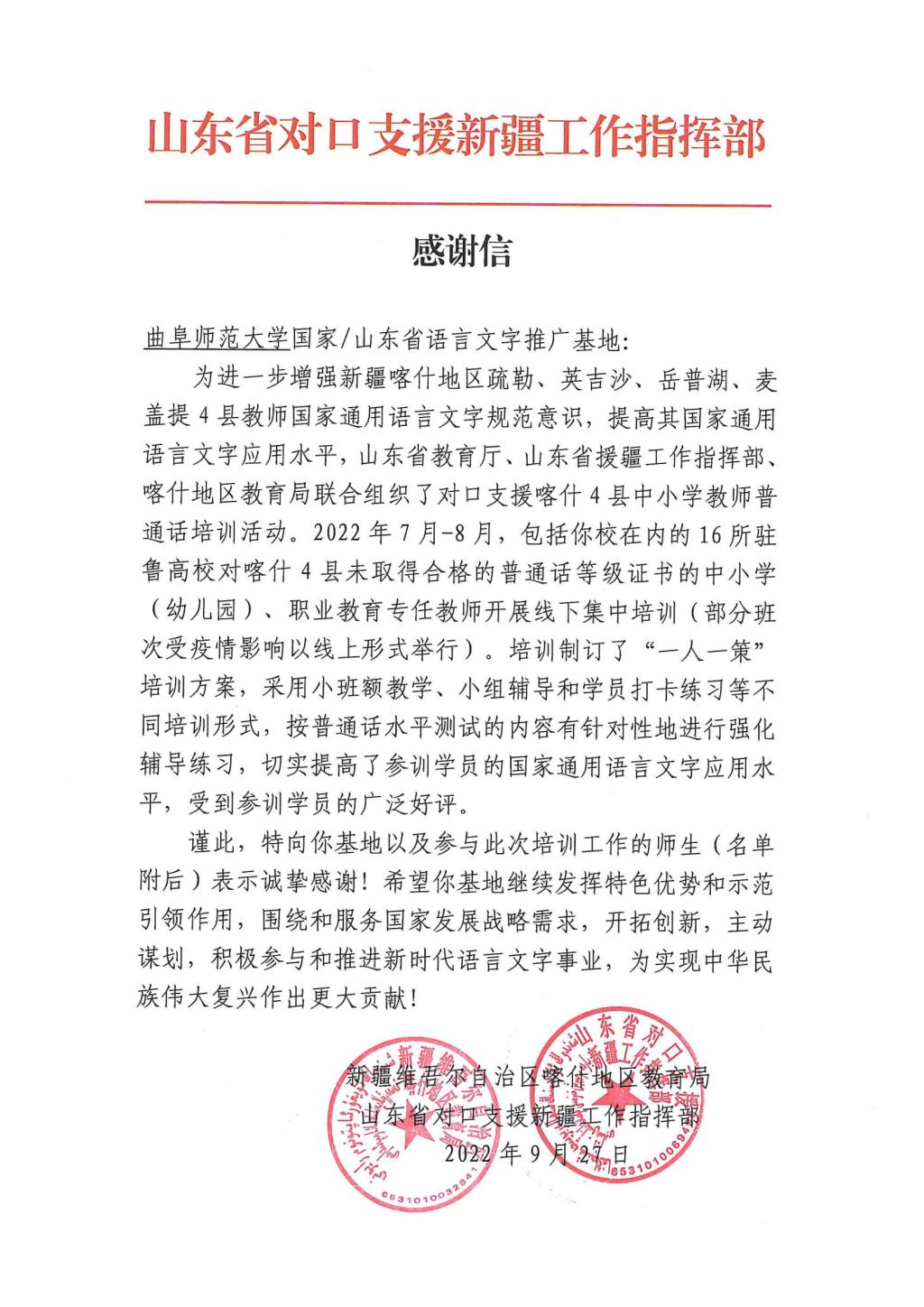 曲阜师大新闻中心讯 9月27日,万象城官方网站国家语言文字推广基地收到一封特殊的感谢信,这封感谢信来自新疆维吾尔自治区喀什地区教育局、山东省对口支援新疆工作指挥部,跨越东西万里山河只为表达这浓浓的感激之情。信中对万象城官方网站国家语言文字推广基地以及参加对口新疆喀什地区普通话培训工作的师生表示诚挚感谢,并对培训成果进行了充分的肯定。