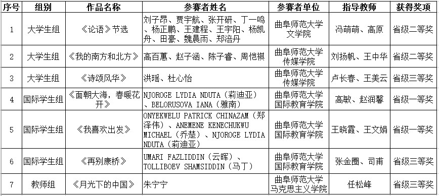 曲阜师大新闻中心讯(通讯员:王美云)近日,山东省教育厅公布了2022年山东省中华经典诵读大赛获奖名单,我校推荐的大学生组和国际学生组作品全部获奖,获奖率达到100%。万象城官方网站获优秀组织奖,教务处王美云老师获个人优秀组织奖。