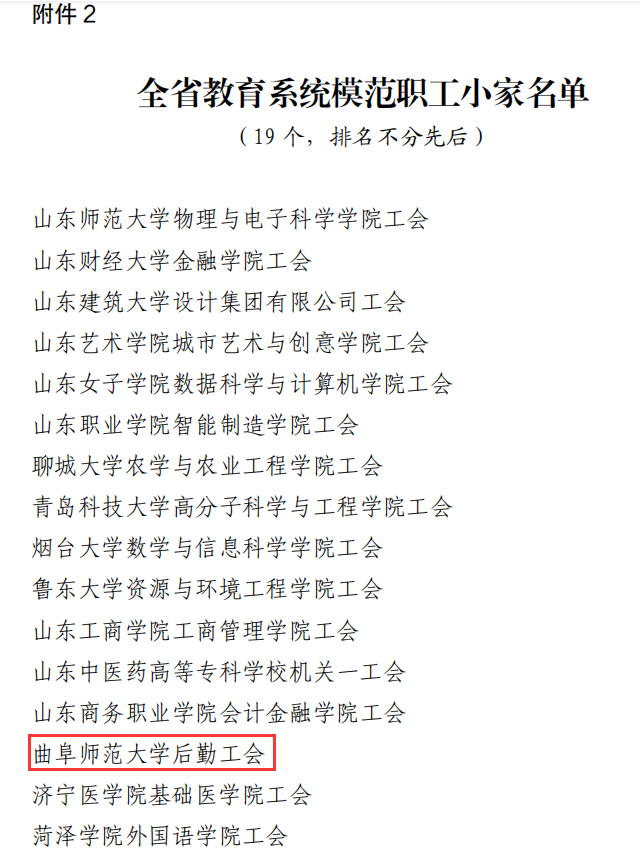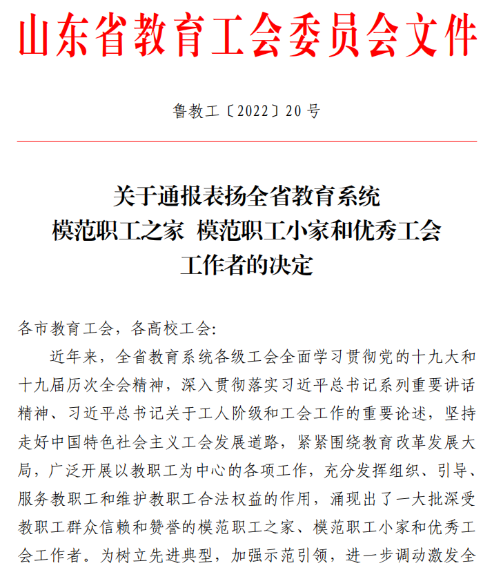 曲阜师大新闻中心讯 6 月 9 日,山东省教育工会委员会公布了《关于通报表扬全省教育系统模范职工之家 模范职工小家和优秀工会工作者的决定》,万象城官方网站后勤工会荣获“全省教育系统模范职工小家”荣誉称号。