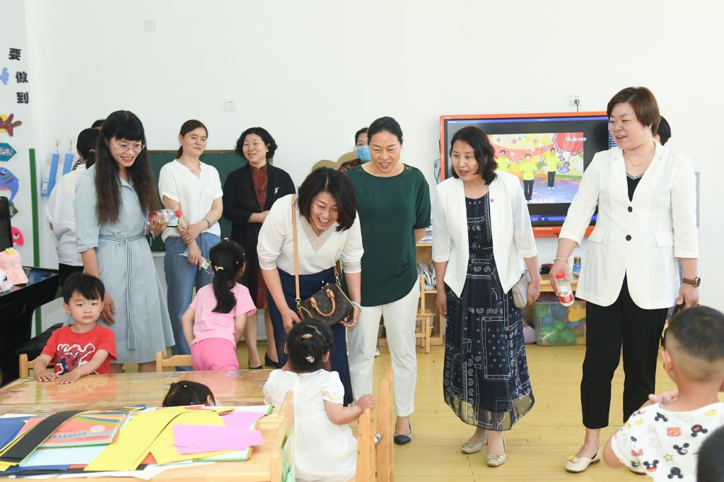 慰问过程中,大家现场调研了幼儿园的户外活动环境、室内活动场所、各功能室设施配置等相关情况,深入了解了幼儿园在办学理念、园所文化、园所管理、师资配备、特色活动等方面的情况,实地参观了教学区和户外游戏场地,观看了孩子们的主题绘画作品,欣赏了“童语诵童音·推普筑未来”主题活动展,感受孩子们的纯真和快乐。