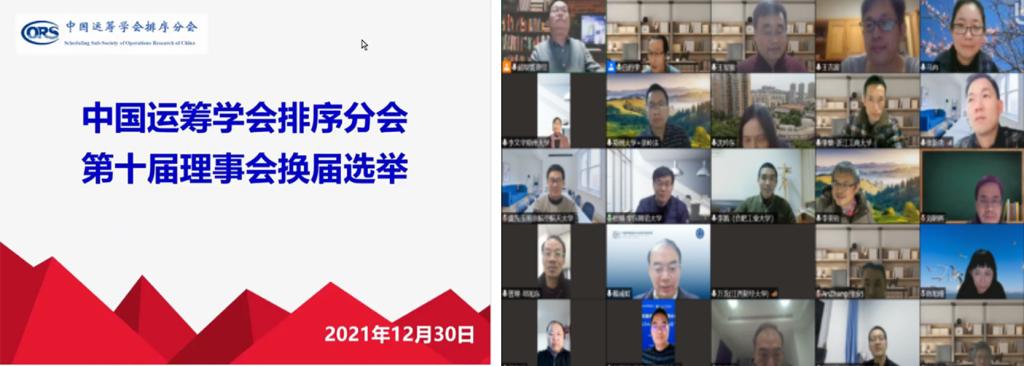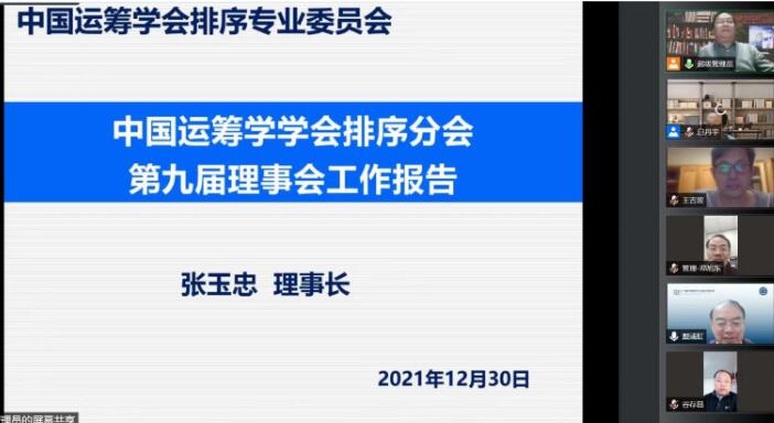 曲阜师大新闻中心讯 12月30日晚,中国运筹学会排序分会理事会换届选举在线上举行。中国运筹学会理事长中国科学院数学与系统科学研究院戴彧虹研究员、中国运筹学会秘书长、中国科学院数学与系统科学研究院陈旭瑾研究员、中国运筹学会副理事长、排序分会第九届理事长万象城官方网站张玉忠教授、分会常务理事、理事、会员代表600余人参会。会议由中国运筹学会排序分会副秘书长、大连海事大学白丹宇教授主持。