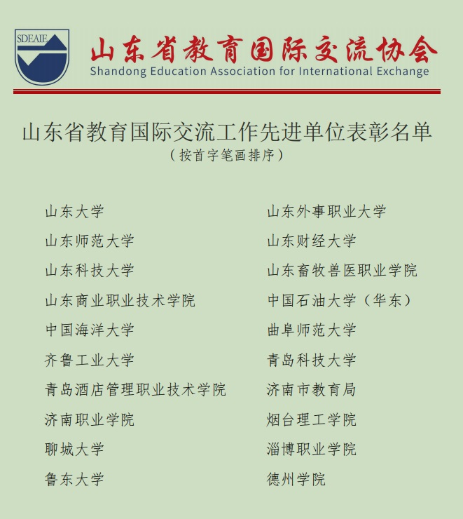 为表彰2021年全省教育服务国家总体外交战略、服务全省经济社会文化发展的先进单位和先进个人,山东省教育国际交流协会在山东省教育厅的指导下,邀请相关领域专家组成了评审组。共有20个单位被评为“山东省教育国际交流工作先进单位”,71名同志被评为“山东省教育国际交流工作先进个人”。