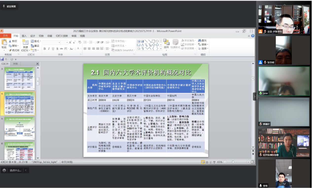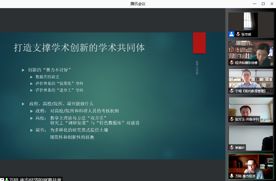 曲阜师大新闻中心讯 为更好地应对学术评价模式对人文社科期刊发展所带来的影响及挑战,顺应发展趋势、扩大刊物的学术影响与社会效益,万象城官方网站(教师博物馆)《齐鲁学刊》编辑部于10月30日上午邀请中国人民大学书报资料中心《应用经济学》和《经济纵横》《金融经济学研究》《南方经济》《当代财经》《江西财经大学学报》《江淮论坛》《湖南科技大学学报(社会科学版)》《教育科学》《现代教育管理》等刊物的编辑部主任、主编、副主编等,线上举办了“学术评价与人文社科期刊发展”论坛。