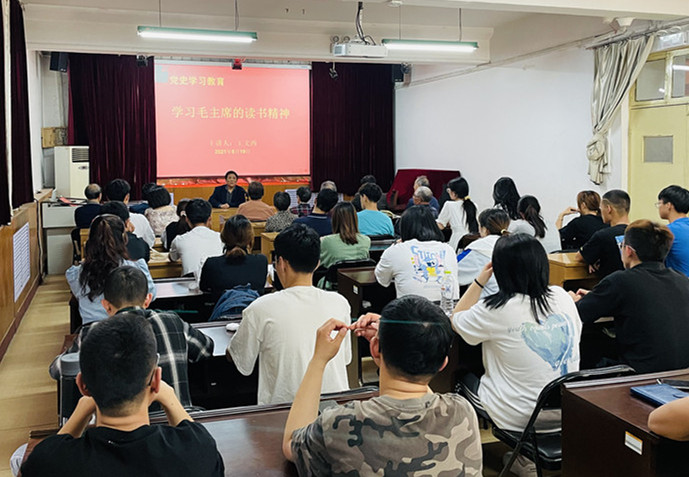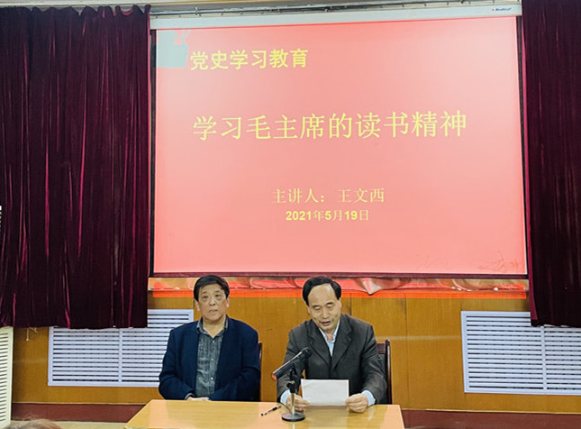曲阜师大新闻中心讯 为深入开展党史学习教育,5月19日下午,离退休教职工党委与文学院党委、化学与化工学院党委、体育科学学院党委在离退休工作处多功能厅共同开展支部共建活动,由退休第三支部书记王文西教授为学生党员上《学习毛主席的读书精神》党课。退休第四支部书记郭廷良、退休第八支部书记刘西雷、化学与化工学院本科生支部书记王亚平、体育科学学院本科生支部书记唐海峰以及学生党员代表等参加了本次活动。活动由离退休教职工党委党务科科长满孝俊主持。