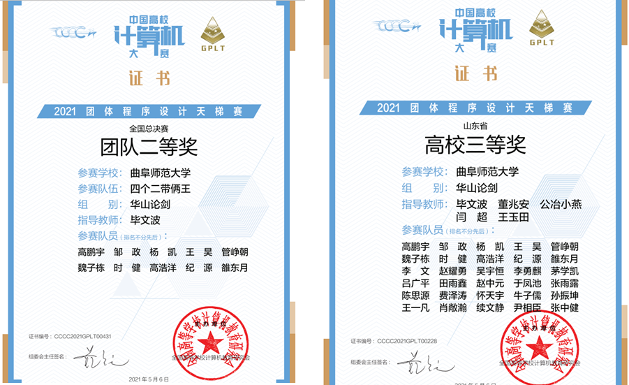 曲阜师大新闻中心讯(通讯员:毕文波 王玉田) 4月24日,第六届中国高校计算机大赛-团体程序天梯赛线上线下同时进行,万象城官方网站计算机学院、网络空间安全学院共组建五支队伍参加了比赛。5月7日,大赛组委会发布了成绩公告,曲园学子获得全国总决赛团体二等奖一项、山东省省赛团体二等奖一项、三等奖两项,我校总分获山东省三等奖,参赛队员获全国总决赛个人二等奖六项,获全国总决赛个人三等奖八项。