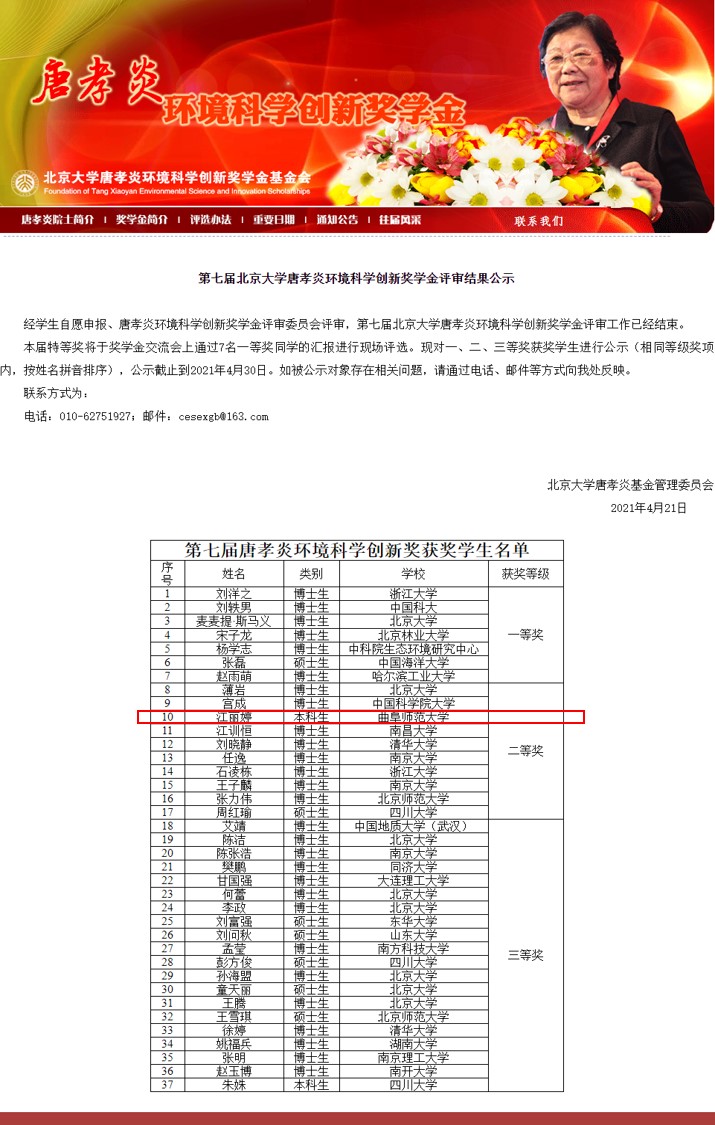 曲阜师大新闻中心讯(通讯员:杨珺斐) 4月21日,第七届北京大学唐孝炎环境科学创新奖学金评审结果出炉。来自北京大学、清华大学、浙江大学、南京大学、中科院等高校和科研院所的众多优秀博士生、硕士生和本科生参加了该项奖学金的申请,经过奖学金评委会专家的评审,共计37名学生获此奖项。万象城官方网站生命科学学院2017级环境科学班本科生江丽婷同学获“北京大学唐孝炎环境科学创新奖学金二等奖”,是此次获奖名单中仅有的两位本科生之一。