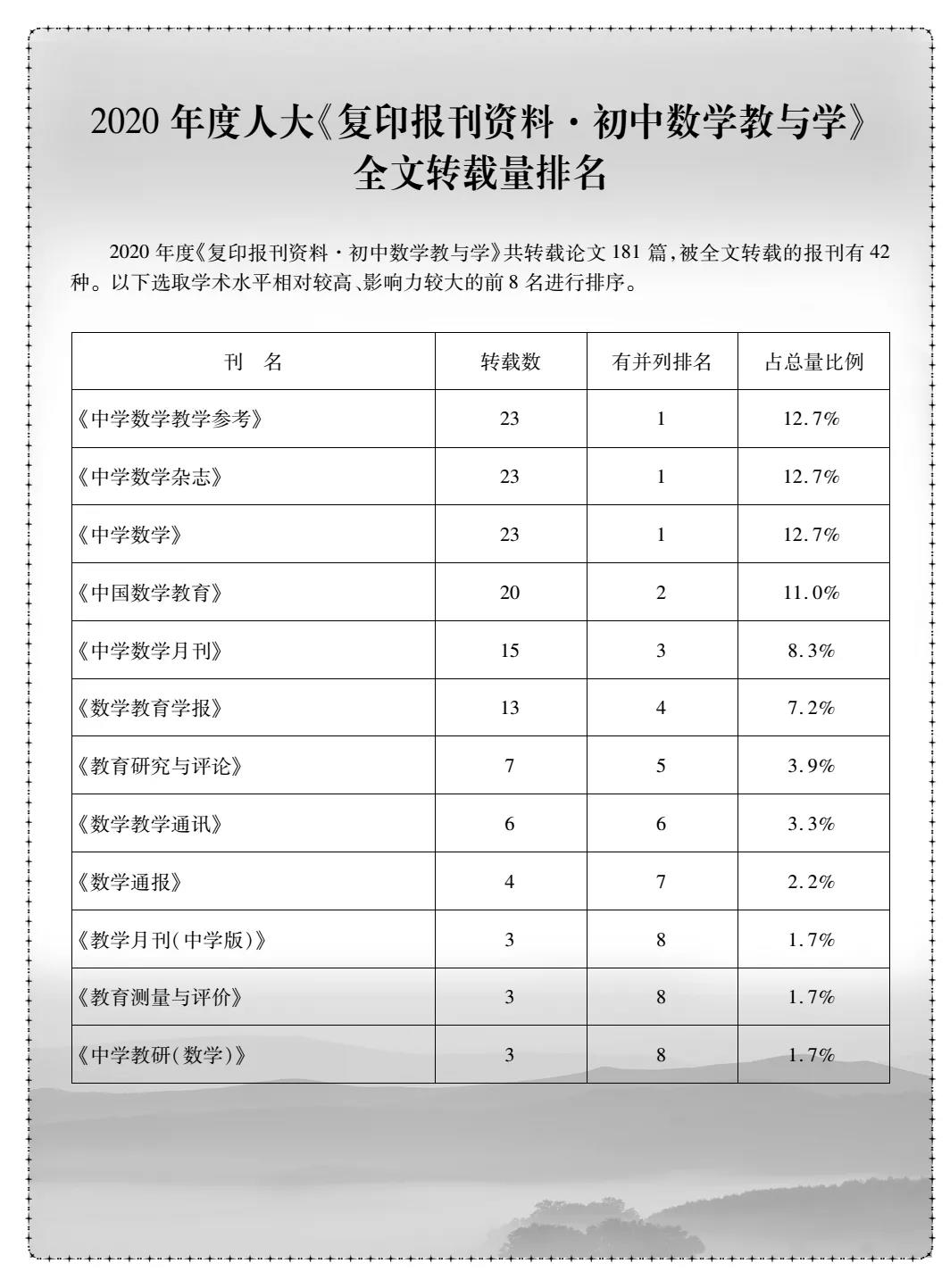 曲阜师大新闻中心讯    新年伊始,曲阜师大《中学数学杂志》传来喜讯:根据中国人民大学书报资料中心全文数据库检索情况,《中学数学杂志》被《复印报刊资料》系列刊(2020年度)全文转载的文章达到40篇,排名再创新高。《复印报刊资料·初中数学教与学》共转载论文181篇,被全文转载的报刊有42种,《中学数学杂志》(初中版)被转载23篇,占总量的12.7%,由2019年的第四名升至第一名;《复印报刊资料·高中数学教与学》共转载论文183篇,被全文转载的报刊有42种,《中学数学杂志》(高中版)被转载17篇,占总量的9.3%,篇数比2019年有所增加,排名第五。