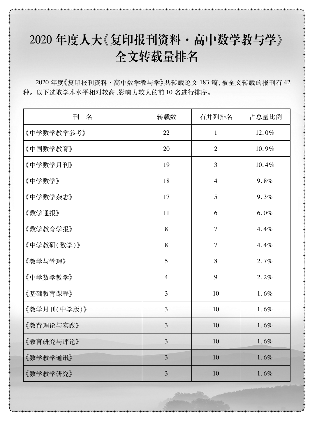 《中学数学杂志》2020年度被人大复印报刊资料全文转载量排名再创新高