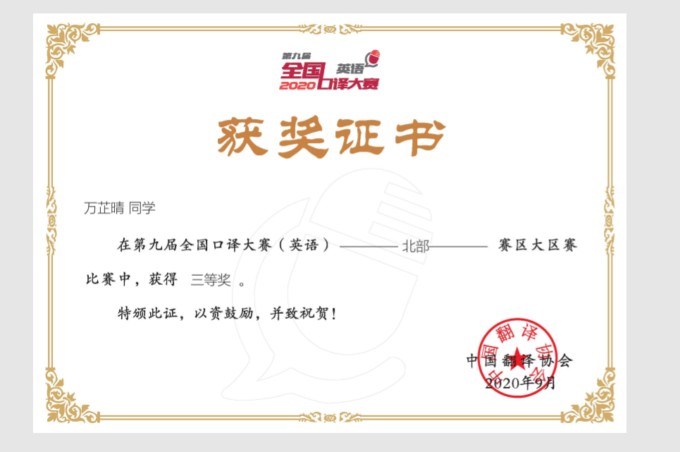 曲阜师大新闻中心讯(通讯员:孙晓兰 厉平执)近日,第九届全国口译大赛(英语)北部赛区大区赛圆满结束,我校翻译学院2019级硕士研究生万芷晴、2017级翻译本科生苏悦分别荣获三等奖,2018级翻译本科生姜睿芯荣获优秀奖及“译员风采奖”。