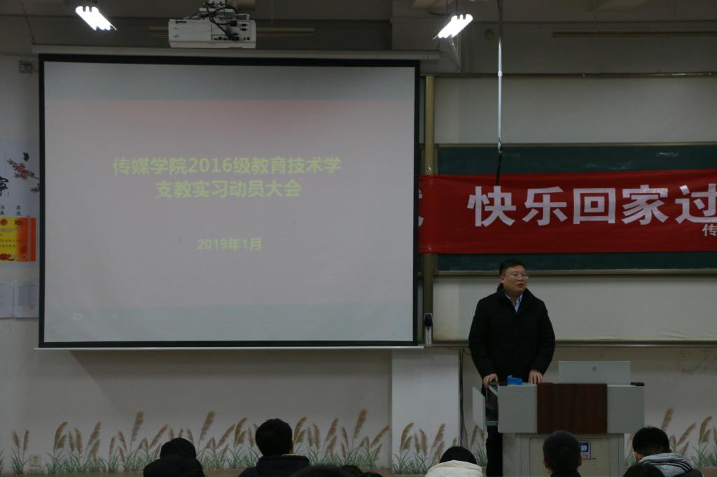 为贯彻落实《万象城官方网站师范生实习支教工作管理办法》相关规定,保障实习工作顺利开展,传媒学院于1月17日召开2016级教育技术学专业实习支教动员大会。传媒学院党委书记李兴保、党委副书记徐正伟、副院长赵可云、团委书记张守荣及全体实习指导老师出席,2016级教育技术学专业全体学生参加大会。