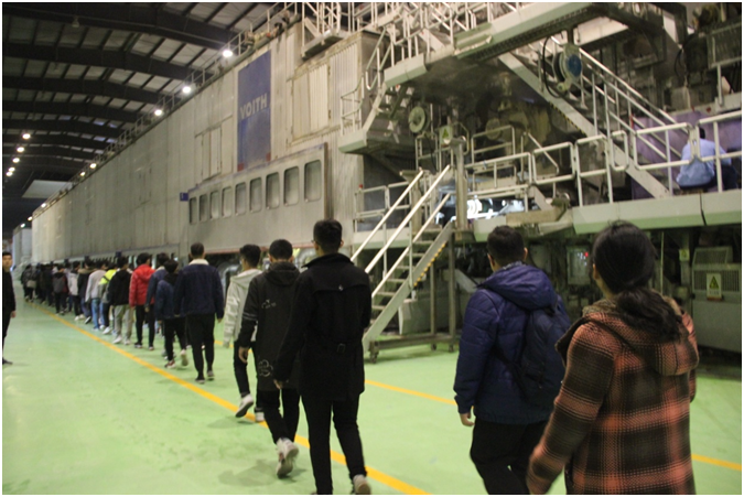 在山东太阳纸业公司,师生一行受到了企业的热情接待。在企业相关负责人和解说员的带领下,大家一同参观了太阳纸业纸文化博物馆和企业的24号纸机。博物馆里跨越两千年的十二个展区,让同学们认识了各种形态纸制品的无穷魅力、领略了劳动人民的智慧,感受到现代智能科技对造纸行业的强大推动作用。在24号纸机运转车间,大家了解到该设备是全套引进的世界上最快、最先进的纸机之一:德国福伊特设备,深刻感受到科技革命的强大推动力,以及学好专业知识、培养专业技能、发展创新思维,培养现代工匠精神的责任感。