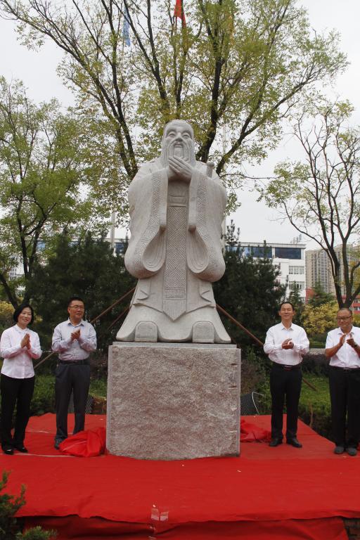 上午九时,在现场嘉宾及师生代表的共同见证下,辛杰和王恩彬为孔子圣像揭幕,鲁国春和郭洪洁为孔子圣像敬献花篮。师生代表恭读祭文,呼吁大家牢记圣训,明确使命;师生向孔子塑像行鞠躬礼;1000名师生齐诵《论语》,歌颂孔子一生的功绩、治学思想与教育理念。鲁国春在讲话中表示,尊立孔子像于校园,就是希望老师们、同学们与孔子的身影为伴,更以他的智慧与人格为标尺,丈量每天的进步与成长,时刻不忘孔子倡导的“恭、宽、信、敏、惠”的处世治学原则,并以此作为立人立业的基座。