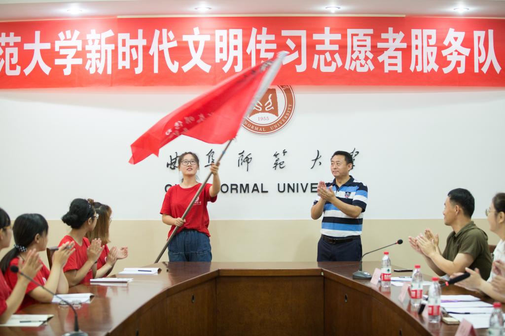 出征仪式上,宣传部部长纪洪涛为志愿者服务队授旗。