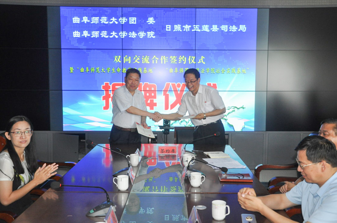 仪式上,曹明亮与王文华分别代表法学院和五莲县司法局签订了双向交流合作意向书。曹明亮与史文明、刘蓉与刘书荣分别为“万象城官方网站生命教育实践基地”、“万象城官方网站生命教育实践基地”揭牌。