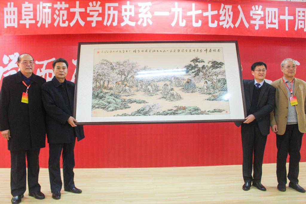 会上,七七级校友代表马全印、邓洪基向历史文化学院赠送了巨幅画作《杏坛春晖》,以此表达对母校和院系的美好祝福。与会师生共同观看了学校新区规划设计方案,了解了学校新区的建设规划概况。