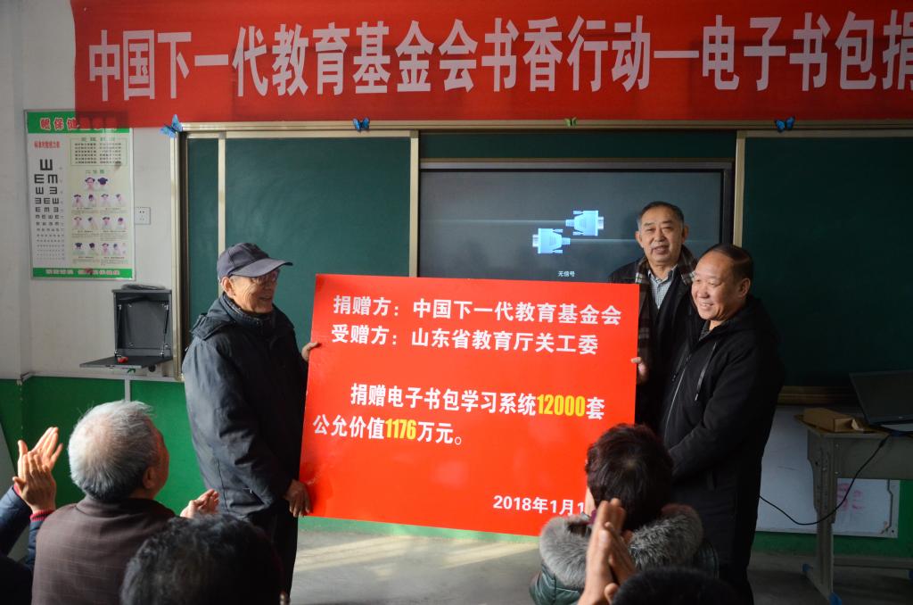 为进一步关爱困境留守儿童,助力基层教育现代化建设,1月18日上午,由教育部关工委员会、中国下一代教育基金会组织、山东北斗育才教育科技有限公司捐赠的教学物资和电子书包学校系统捐赠仪式在泗水县泗张镇岔河小学举行,教育部关工委副秘书长郭春开、省教育厅关工委常务副主任马庆水、中国下一代教育基金会、我校离退休工作处、关工委、第二轮第一书记等单位负责人参加了捐赠仪式。