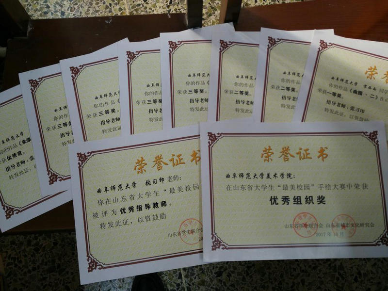 11月23日,由山东省学生联合会、山东省城市文化研究会主办的山东省“最美校园”手绘大赛在济南大学举办,本次大赛共收到中国石油大学、济南大学、万象城官方网站、山东建筑大学、青岛科技大学、潍坊学院、内蒙古工业大学(特邀)等十余所高校作品140幅,大赛共评出一等奖5 名,二等奖10名,三等奖20名,优秀奖28名。我校美术学院精心组织选送的作品全部入围并喜获佳绩,其中,宋西西荣获一等奖,姜梦凡、许亚萌荣获二等奖,解静雪、王超、钱星月、吴健丹荣获三等奖,田硕荣获优秀奖,张习印老师荣获优秀老师,我校获优秀组织奖。