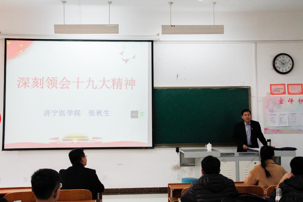 根据日照市委高校工委统一安排,12月20日,日照市十九大精神宣讲团成员、济宁医学院日照校区管理办公室直属党支部书记张秋生来我校作了题为《深刻领会十九大精神》的宣讲报告,我校师生代表百余人聆听了宣讲。活动由我校经济学院党委副书记胡一杰主持。