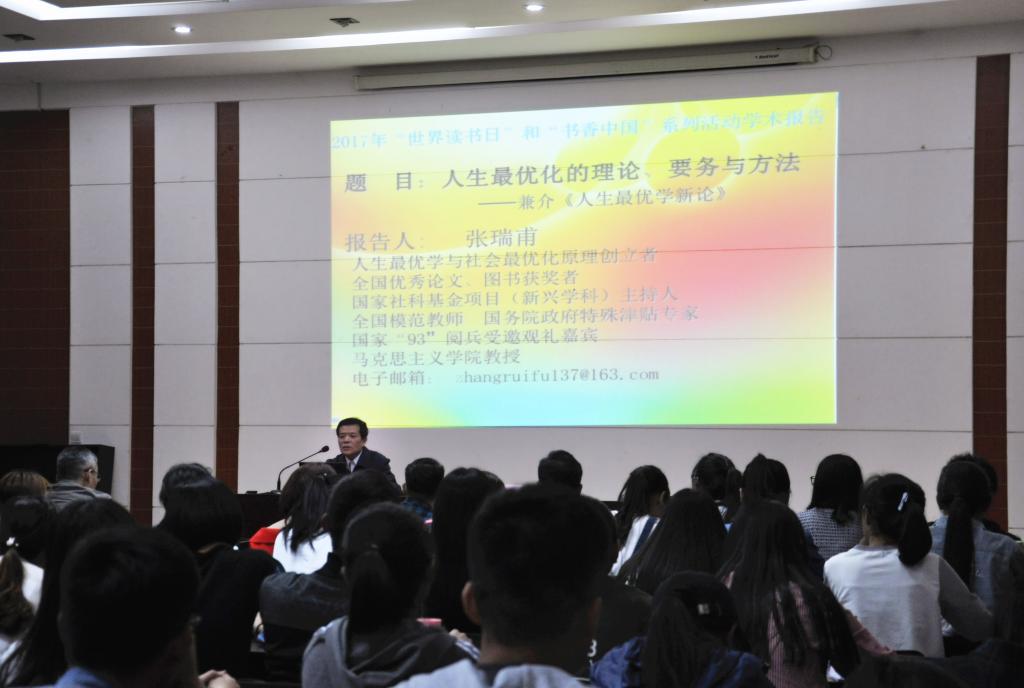 在活动闭幕式上,张瑞甫教授为大家作了“人生最优化的理论、要务与方法 ——兼介《人生最优学新论》”精彩报告。报告中张教授结合自身的经历以及中外故事,深入浅出地向与座同学介绍了人生最优化的理论、要务及方法。张教授指出:读书是认识自我并优化人生的一种重要手段,同学们在大学期间之人生的黄金时间段应该规划好自己的大学生活,多读书,多读理论书,读有用书。