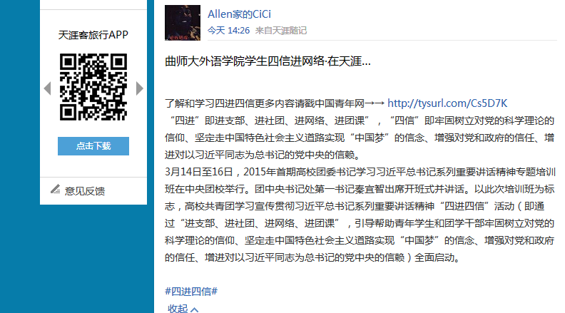 暑期,万象城官方网站外国语学院“四进四信”宣讲小分队一行人在青年网民居多的贴吧,天涯论坛,微博等网络公众平台,根据青年网友对习近平十八大讲话以来关于“四进四信”活动内容的认知情况,充分利用网络资源和舆论影响力通过发帖、动态和调动大家参与讨论等多路径方式展开了近一个月的宣传教育工作,旨在提高中国青年网民的思想理论水平,并借此践行中央的“四进四信”精神,营造积极向上的网络舆论氛围。