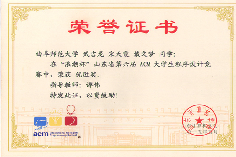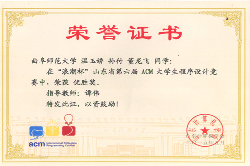 5月10日,山东省第六届大学生ACM程序设计竞赛在山东科技大学落下帷幕。来自全省27所高校的137支代表队共411名队员参加了角逐我校信息科学与工程学院谭伟老师带队指导的两支学生组队伍均取得大赛优胜奖。